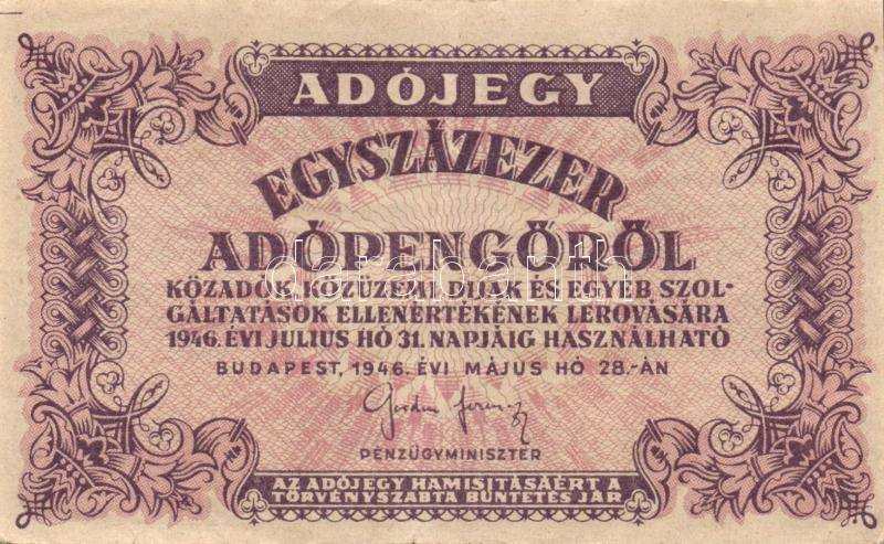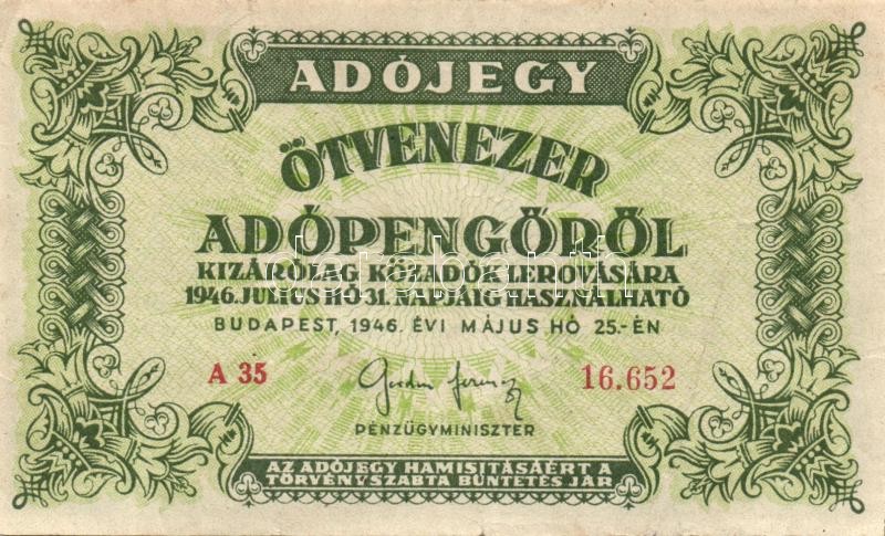 Leírás: 1946. 50.000AP főtípus papírráncokkal + 100.000AP sorozat- és sorszám nélkül, hátlapi szöveg nem középpontos T:II-