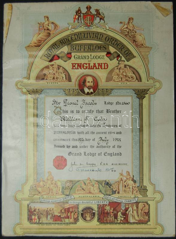 1977 Angol szabadkőműves oklevél kartonlapra felragasztva, Sir Lionel ... https://www.darabanth.com/hu/118-Gyorsarveres/118.0/Festmeny-mutargy-papirregiseg-egyeb/Okmanyok-Documents~333/1977-Angol-szabadkomuves-oklevel-kartonlapra-felragasztva-Sir-Lionel-Jacobs-nevre-kiallitva~II315573