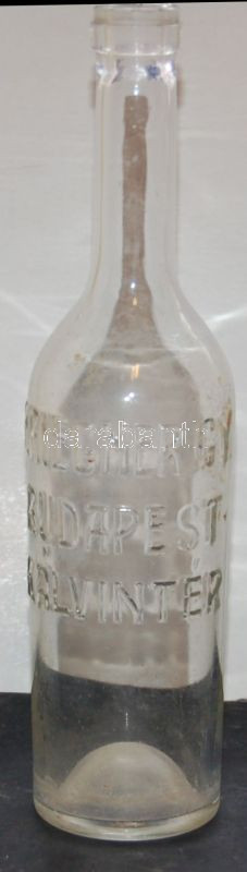 Leírás: Régi, 25 cm magas, keskenyített nyakú üveg ´Kriegher Gy. Budapest Kálvin tér´ felirattal