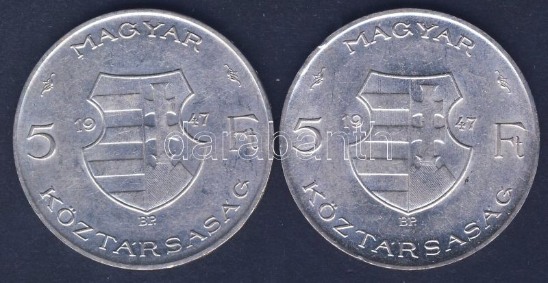 1947. 5Ft Ag "Kossuth" (2x) T:2,2/3 https://www.darabanth.com/hu/119-Gyorsarveres/119.0/Numizmatika/Magyar-es-magyar-verdejelu-fem-es-ezustpenzek-a-kozepkortol-napjainkig~40197/1947-5Ft-Ag-Kossuth-2x-T2-23~II321440