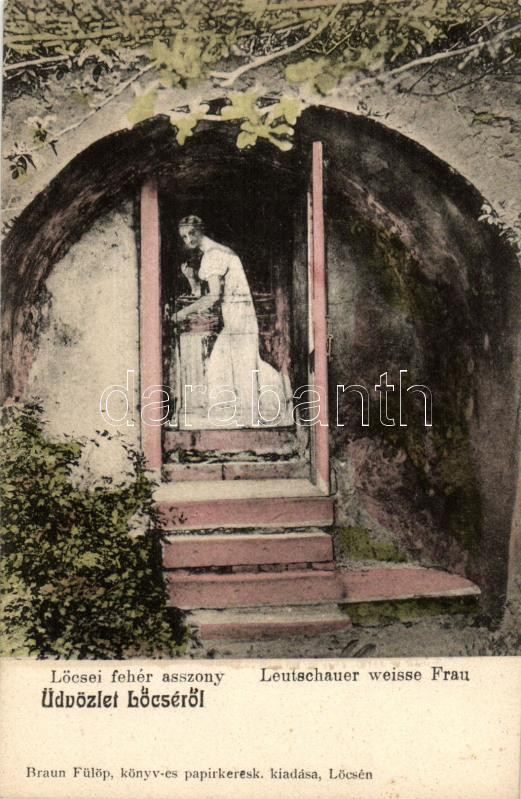Lőcse, Lőcsei fehérasszony; Braun Fülöp kiadása https://www.darabanth.com/hu/12-Fix-aras-ajanlatunk/12.2/Kepeslapok/Felvidek~6610/Locse-Locsei-feherasszony-Braun-Fulop-kiadasa~II1201793