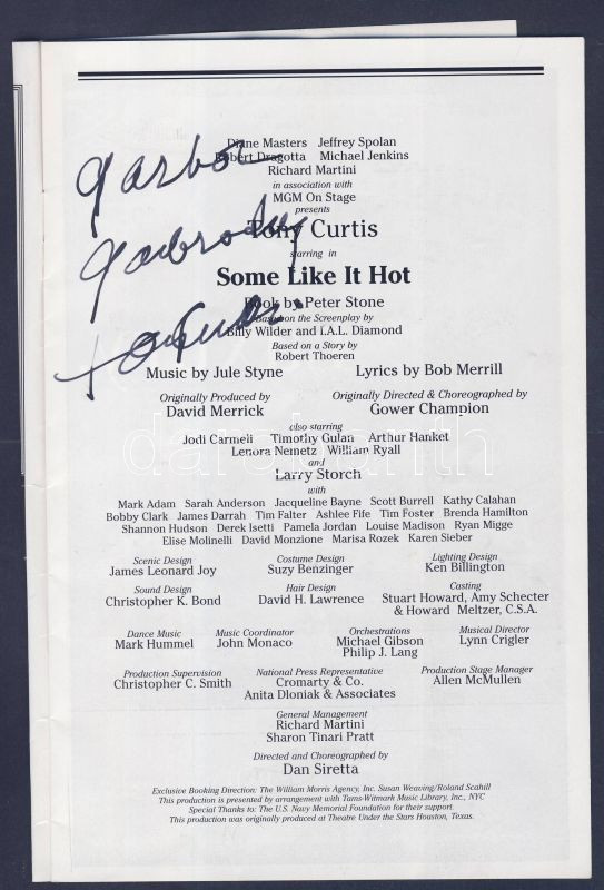 Leírás: Tony Curtis saját lezű aláírása a Van aki forrón szereti c. film musical programfüzetén / Signature of Tony Curtis on musicals programme booklet