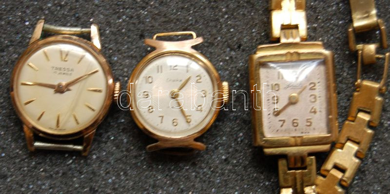 Leírás: 3db aranyozott női karóra, ebből egy darab szíjjal, bevizsgálásra szorulnak működésüket illetően