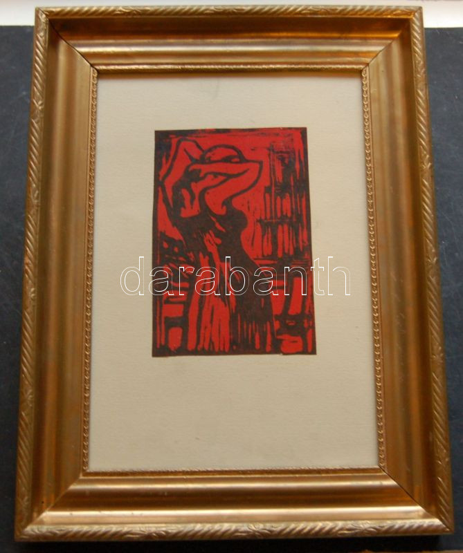 Leírás: Öltözködő nőt ábrázoló fametszet aranyozott és üvegezett keretben (37 x 26cm)