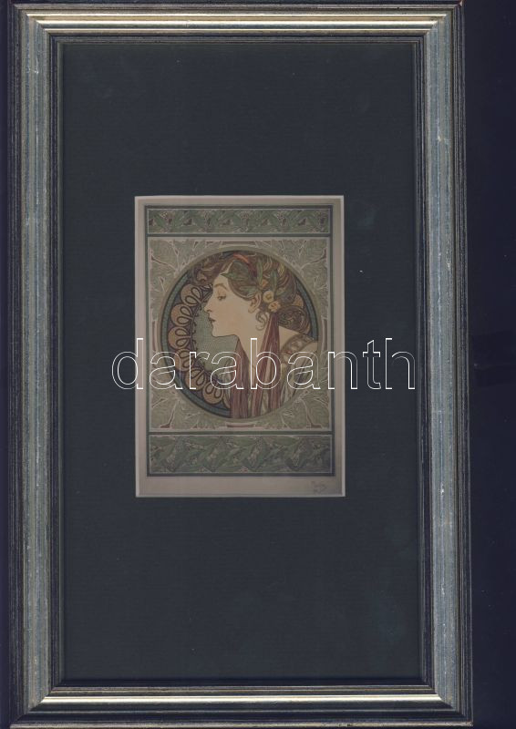 Leírás: Mucha jelzésű női arcot ábrázoló nyomat paszpartuba és üvegezett keretbe foglalva 30 x 19cm-es méretben