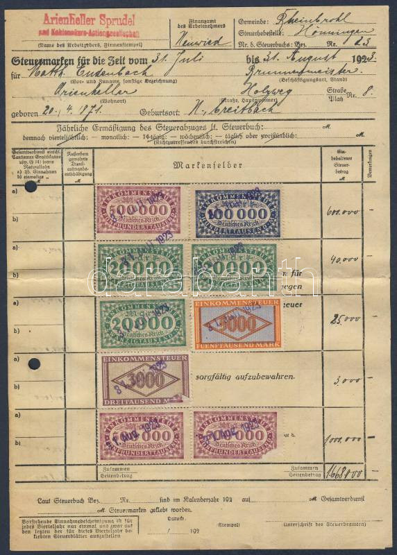 1923 Deutsches Reich adóív 51 db magas értékű inflációs forgalmi adó b... https://www.darabanth.com/hu/120-Gyorsarveres/120.0/Festmeny-mutargy-papirregiseg-egyeb/Okmanyok-Documents~367/1923-Deutsches-Reich-adoiv-51-db-magas-erteku-inflacios-forgalmi-ado-belyeggel~II315073