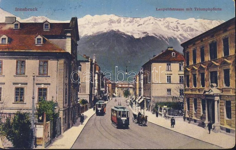 Innsbruck Leopold street with auto garage and trams