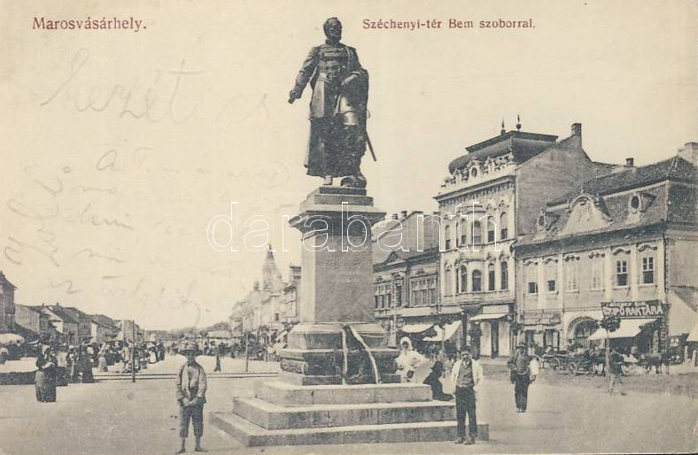 Marosvásárhely Széchenyi square with Bem statue and shoe warehouse https://www.darabanth.com/hu/120-Gyorsarveres/120.0/Kepeslapok/Erdely-Transylvania~4/Marosvasarhely-Szechenyi-square-with-Bem-statue-and-shoe-warehouse~II325404