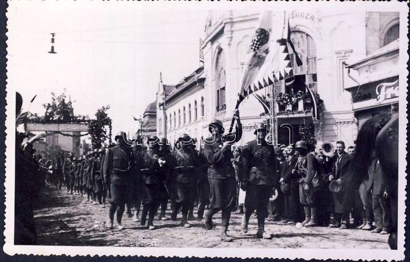 Nagyszalonta military parade in front of the town hall https://www.darabanth.com/hu/120-Gyorsarveres/120.0/Kepeslapok/Erdely-Transylvania~4/Nagyszalonta-military-parade-in-front-of-the-town-hall~II321714