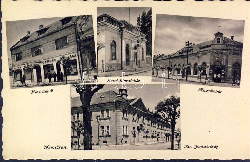 Leírás: Komárom Turul filmszínház Czike boltjával, a Corso Kávéházzal és a járásbíróság épületével