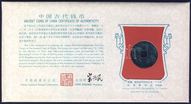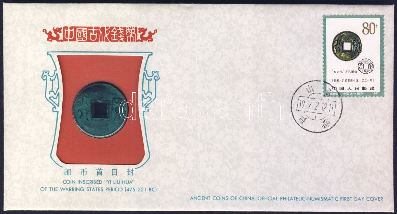 Leírás: Kína/Hadakozó Államok korszaka/Qi királyság ie.475-221. Bronzpénz "YI LIU HUA" bevéséssel replikát érmés, bélyeges elsőnapi borítékon, hátoldali tanúsítvánnyal T:1