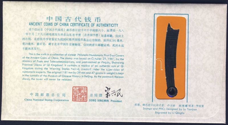 Kína/Hadakozó Államok korszaka/Qi királyság ie.475-221. Késpénz "JIE MO ZHI FA HUA" bevéséssel replikát érmés, bélyeges elsőnapi borítékon, hátoldali tanúsítvánnyal T:1