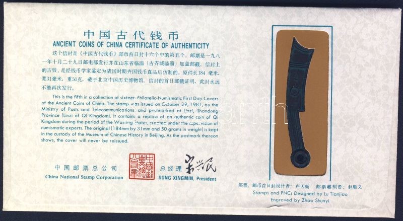 Leírás: Kína/Hadakozó Államok korszaka/Qi királyság ie.475-221. Késpénz "QI FA HUA" bevéséssel replikát érmés, bélyeges elsőnapi borítékon, hátoldali tanúsítvánnyal T:1