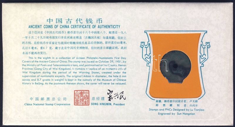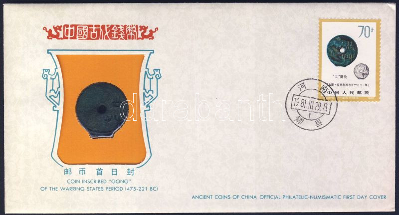 Leírás: Kína/Hadakozó Államok korszaka/Wei királyság ie.475-221. Bronzpénz "GONG" bevéséssel replikát érmés, bélyeges elsőnapi borítékon, hátoldali tanúsítvánnyal T:1