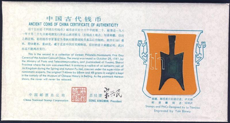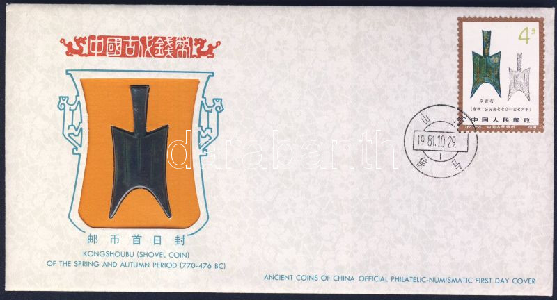 Leírás: Kína/Tavasz-Ősz korszak/Jin királyság ie.770-746. Kongshoubu lapátpénz replikátja érmés, bélyeges elsőnapi borítékon, hátoldali tanúsítvánnyal T:1