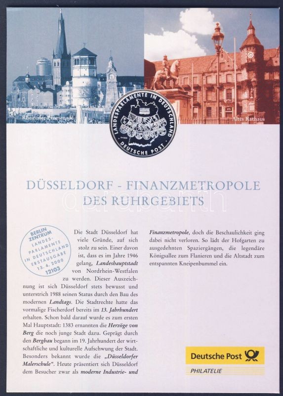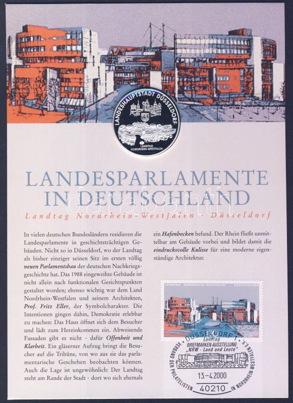 Leírás: Németország 2000. "Düsseldorf" Ag (999) emlékérem 15g kisalakú emlékíven, alkalmi bélyegzős bélyeggel T:PP