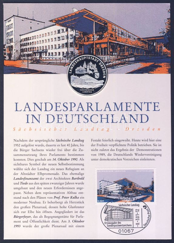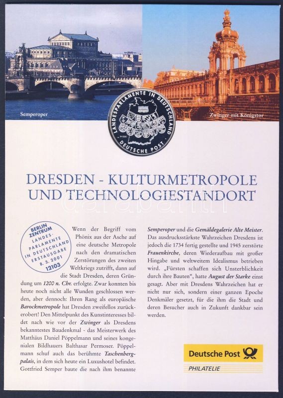 Leírás: Németország 2001. "Drezda" Ag (999) emlékérem 15g kisalakú emlékíven, elsőnapi bélyegzős bélyeggel T:PP