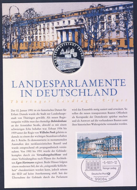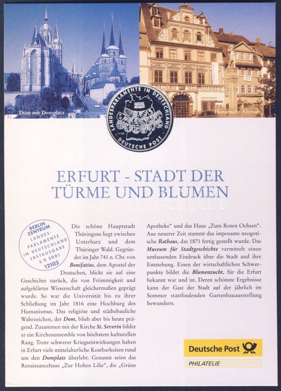Leírás: Németország 2001. "Erfurt" Ag (999) emlékérem 15g kisalakú emlékíven, elsőnapi bélyegzős bélyeggel T:PP