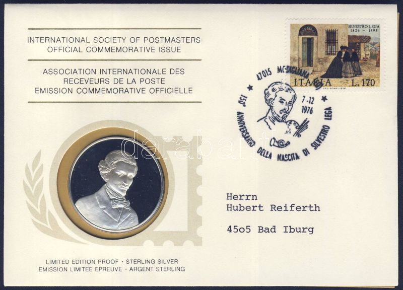 Olaszország 1976. "Silvestro Lega" a Postamesterek gondozásában kiadott Ag emlékérem 20g érmés, bélyeges borítékon, olasz bélyeggel, elsőnapi bélyegzővel, német nyelvű ismertetővel T:PP