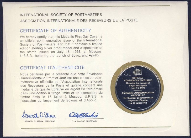 Szovjetunió 1975. "Soyuz és Apollo indítása" a Postamesterek gondozásában kiadott Ag emlékérem 20g érmés, bélyeges borítékon, szovjet bélyeggel, elsőnapi bélyegzővel, német nyelvű ismertetővel T:PP