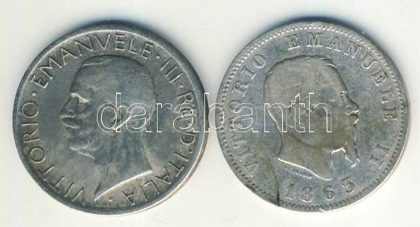Leírás: Olaszország 1863. 1L Ag II.Viktor Emánuel T:3- + 1927. 5L Ag III.Viktor Emánuel T:2-/3+