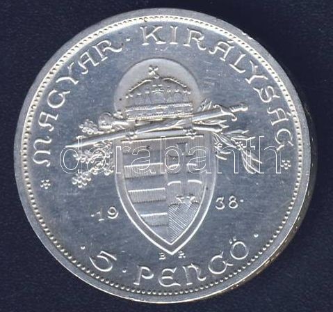 1938. 5P Ag "Szt.István" T:2 ph. https://www.darabanth.com/hu/120-Gyorsarveres/120.0/Numizmatika/Magyar-es-magyar-verdejelu-fem-es-ezustpenzek-a-kozepkortol-napjainkig~30267/1938-5P-Ag-SztIstvan-T2-ph~II324299