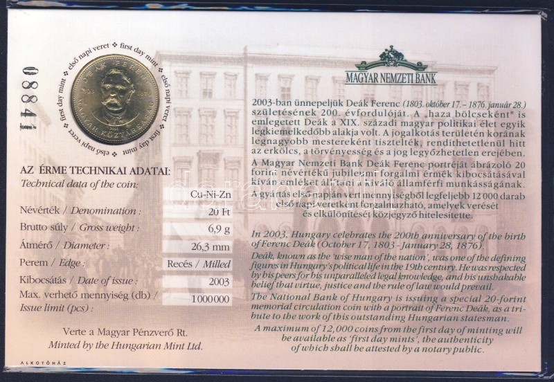 2003. 20Ft "Deák Ferenc" elsőnapi veret számozott emléklapon... https://www.darabanth.com/hu/120-Gyorsarveres/120.0/Numizmatika/Magyar-es-magyar-verdejelu-fem-es-ezustpenzek-a-kozepkortol-napjainkig~30267/2003-20Ft-Deak-Ferenc-elsonapi-veret-szamozott-emleklapon-T1-Csak-12000db~II320532