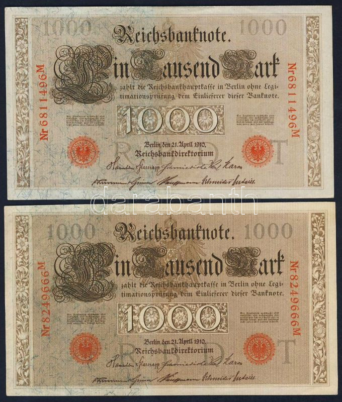 Leírás: Német Birodalom / Császárság 1910. 1000M (2x) piros pecséttel, hétjegyű sorszámmal, zöld fázercsíkkal T:I