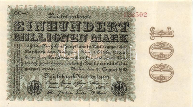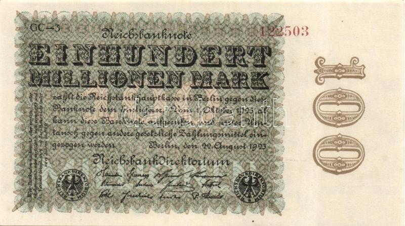 Leírás: Német Birodalom / Weimari Köztársaság 1923. 100.000.000M (3x) céges nyomat "Sterne mit einem S darin" vízjellel, egymás utáni sorszámokkal T:I
