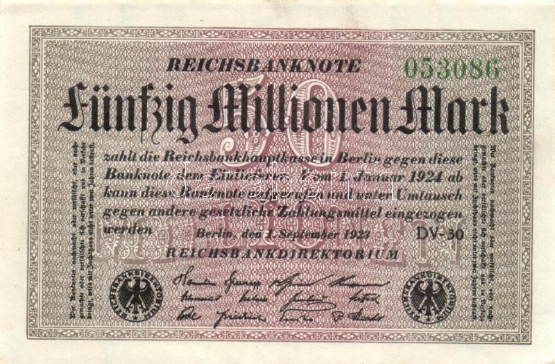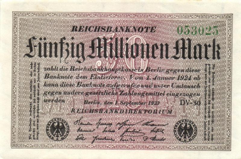 Leírás: Német Birodalom / Weimari Köztársaság 1923. 50.000.000M (2x) fehér papíron, közeli sorszámokkal T:I