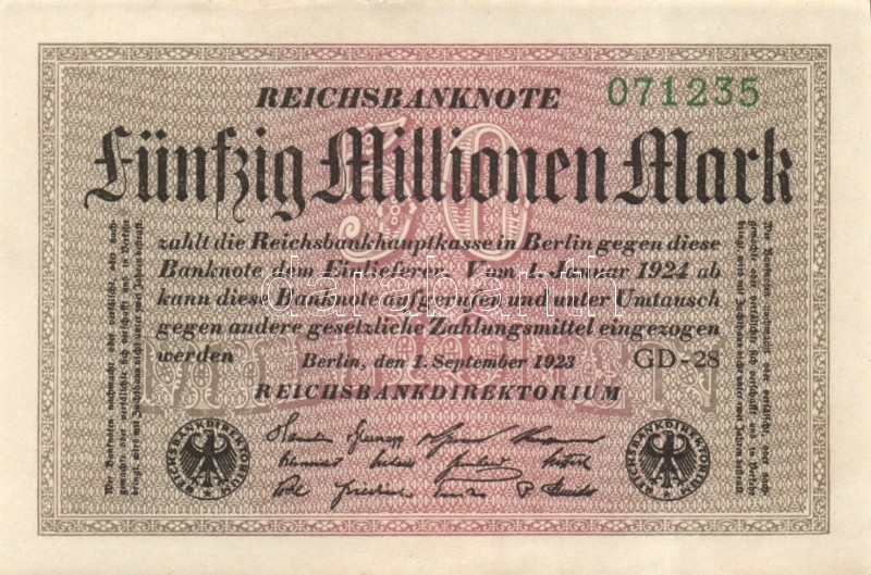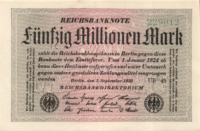 Leírás: Német Birodalom / Weimari Köztársaság 1923. 50.000.000M (2x) variáns fehér papíron, "Gitter mit 8" vízjellel T:I,I-