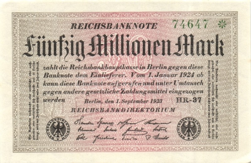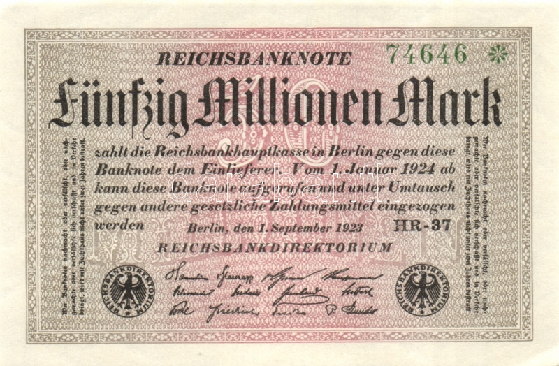 Leírás: Német Birodalom / Weimari Köztársaság 1923. 50.000.000M (2x) variáns fehér papíron, "Hakensterne" vízjellel; ötjegyű, egymás utáni sorszámokkal T:I-