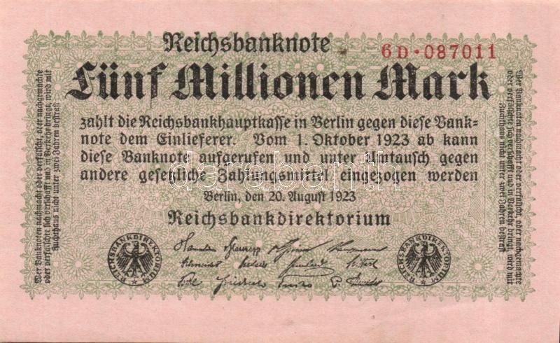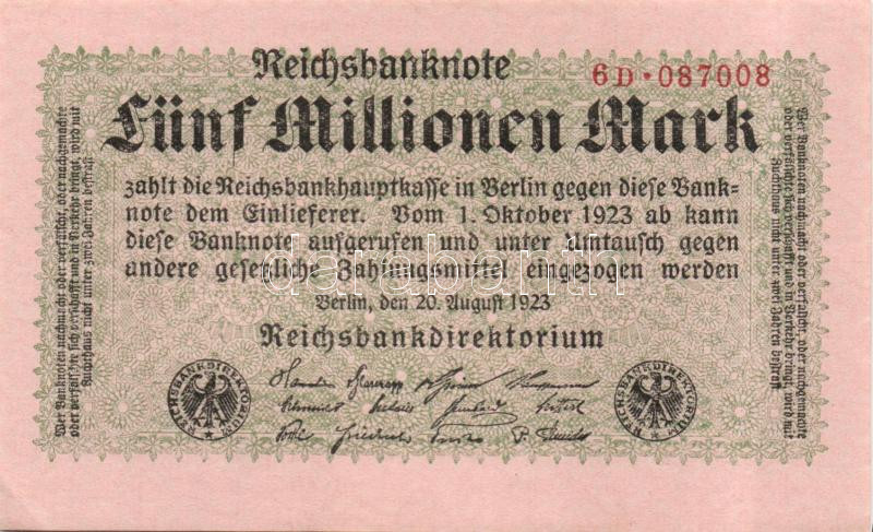 Leírás: Német Birodalom / Weimari Köztársaság 1923. 5.000.000M (2x) cégnyomat kis ugrású sorszámokkal T:I-