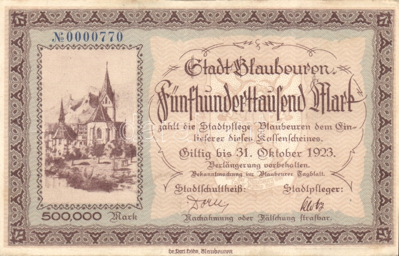 Leírás: Német Birodalom/Weimari Köztársaság/ Blaubeuren 1923.10.31. 500.000M T:II