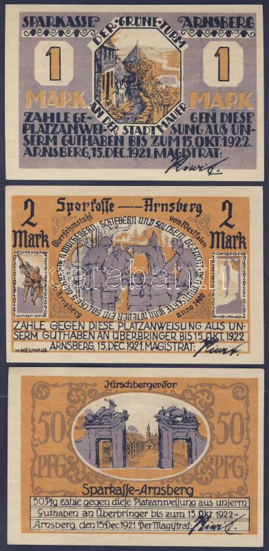 Leírás: Német Birodalom/Weimari Köztársaság/Arnsberg 1921. 50Pf+1M+2M 3klf db, teljes sor T:I