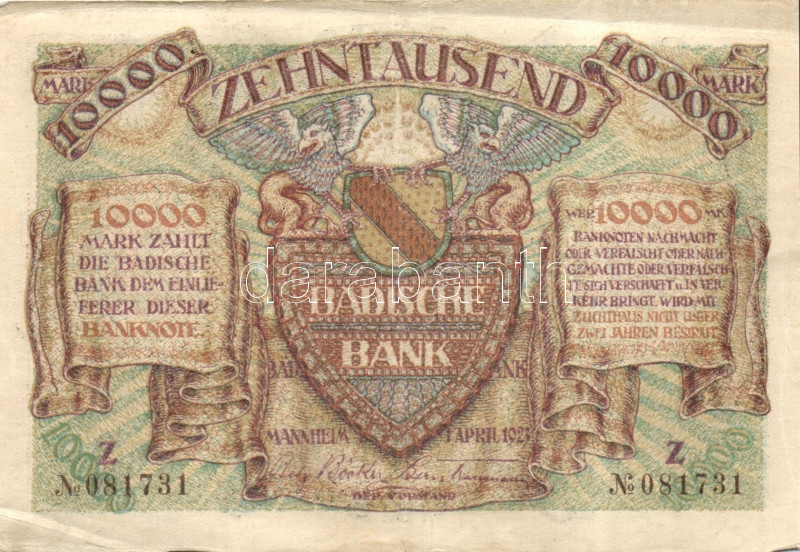 Leírás: Német Birodalom/Weimari Köztársaság/Baden/Länderbanknote/Badische Bank 1923.04.01. 10.000M T:II/III