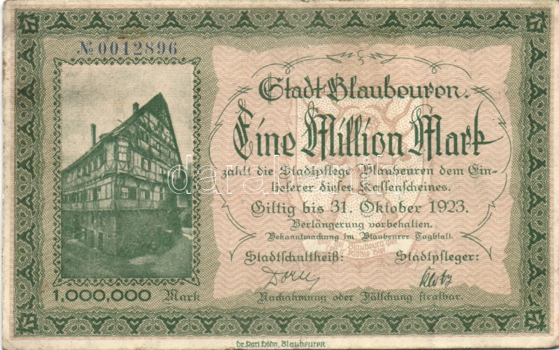 Leírás: Német Birodalom/Weimari Köztársaság/Blaubeuren 1923.10.31. 1000.000M T:II