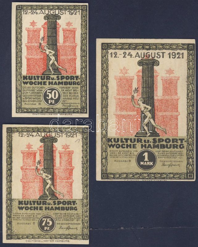 Leírás: Német Birodalom/Weimari Köztársaság/Hamburg 1921. 25Pf+50Pf+75Pf+1M 3klf db, teljes sor T:I
