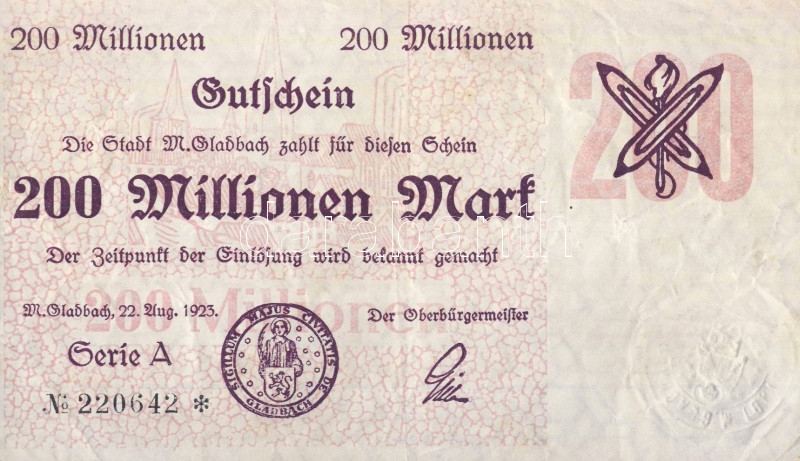Leírás: Német Birodalom/Weimari Köztársaság/München-Gladbach 1923.8.22. 200.000.000M T:II/III
