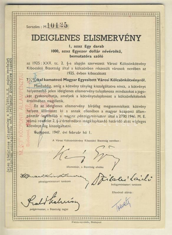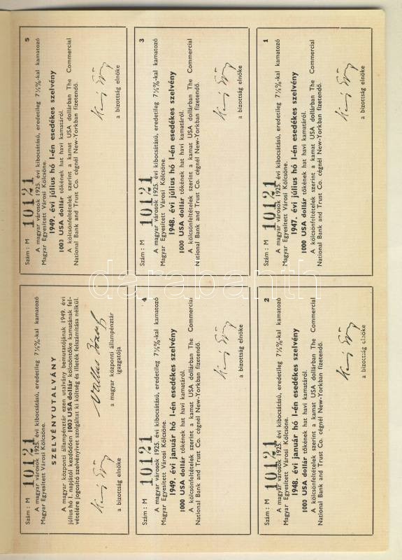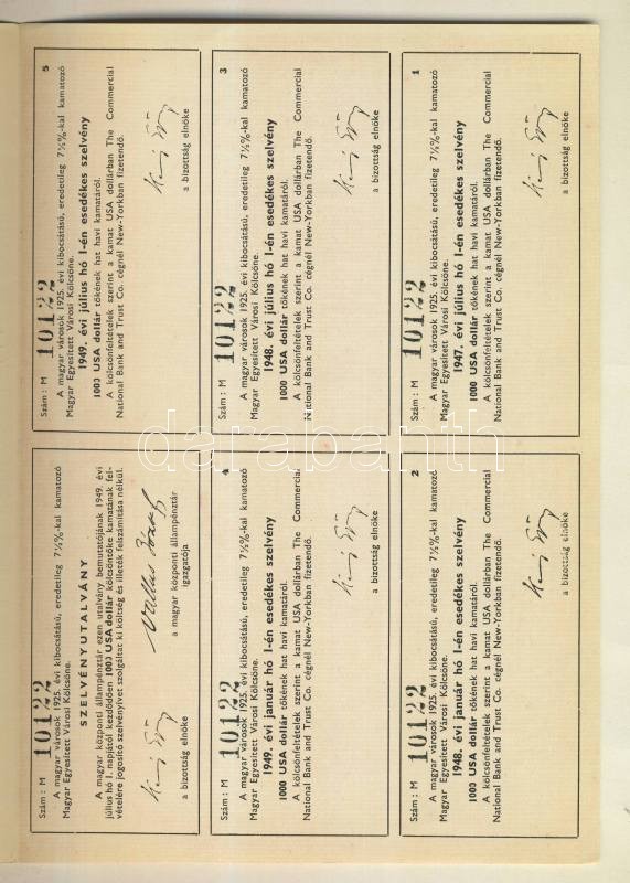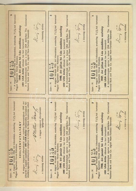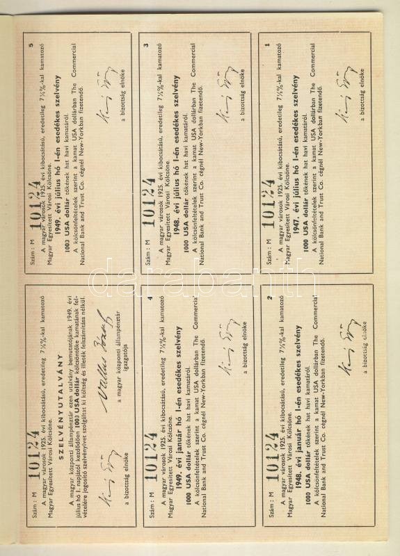 Leírás: 1947. Kötvényhelyettesítő elismervény 1000$ névértékű Budapest/Magyar Egyesített Városi Kölcsönkötvényről (5x) egymásutáni sorszámmal
