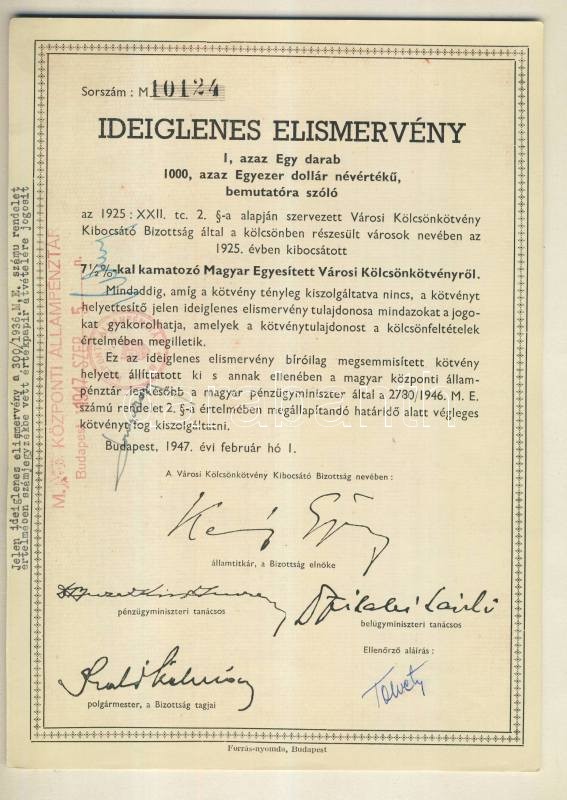 1947. Kötvényhelyettesítő elismervény 1000$ névértékű Budapest/Magyar ... https://www.darabanth.com/hu/120-Gyorsarveres/120.0/Numizmatika/Reszvenyek-ertekpapirok-sorsjegyek-takarekbetetkonyvek-csekkek-valtok~30251/1947-Kotvenyhelyettesito-elismerveny-1000USD-neverteku-BudapestMagyar-Egyesitett-Varosi-K~II312664