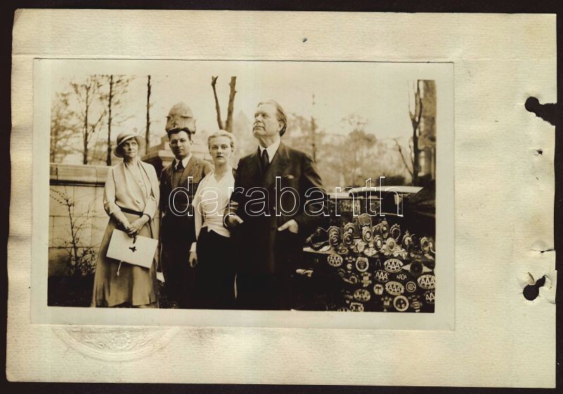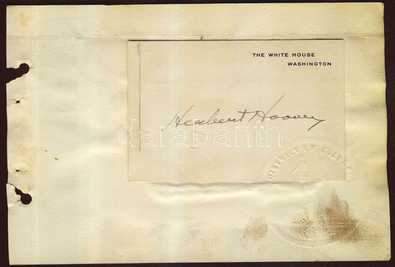 1931 Herbert Hoover, az Egyesült Álamok elnökének saját kezű aláírása fehér-házi kártyán + az elnők Bartha Gyulával - a világot Harley Davidsonon megkerülő Bartha-Sulkowszky páros tagjának - közös fotója / Original photo and autograph of Herbert Hoover the president of the United States. The photo is made with Gyula Bartha motorbiker who rode arount the world on Harley Davidson morotbike in 6 years. Photo 15x9 cm