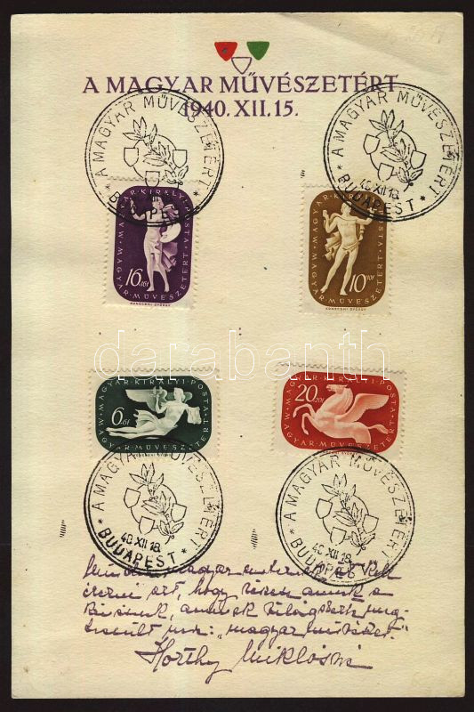 Leírás: 1940.XII.15 Horthy Miklósné saját kézzel írt sorai és aláírása a Magyar Művészetért lebélyegzett és lepecsételt emléklapján