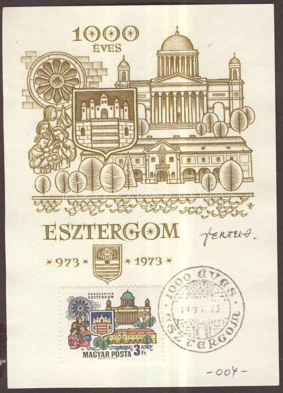 Leírás: Vertel József (1922-1993): 1000 éves Esztergom számozott, jelzett rézkarc, kis szériás, alkalmi bélyegzéssel ellátott emléklapon 11x15 cm
