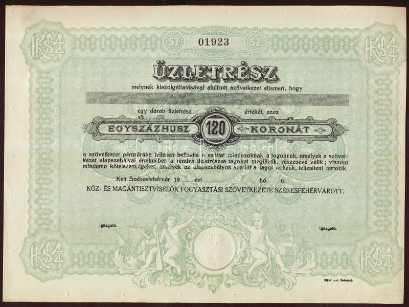 "Köz- és Magántisztviselők Fogyasztási Szövetkezete Székesfehérvárott"... https://www.darabanth.com/hu/125-Gyorsarveres/125.0/Numizmatika/Reszvenyek-ertekpapirok-sorsjegyek-takarekbetetkonyvek-csekkek-valtok-Shares-securities-~300173/Koz-es-Magantisztviselok-Fogyasztasi-Szovetkezete-Szekesfehervarott-uzletreszjegye-120~II344999
