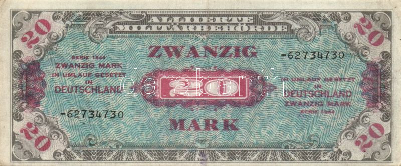 Leírás: Német 3. Birodalom / szövetséges megszállás alatt 1944. 20M USA-nyomat kilencjegyű sorszámmal T:II