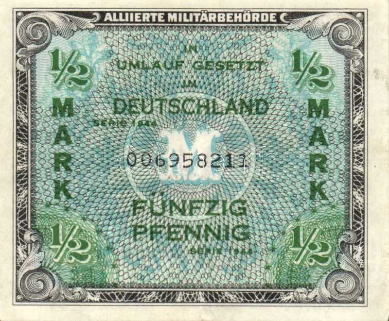 Leírás: Németország szövetségi megszállás alatt 1944. 1/2M USA-nyomat kilencjegyű sorszámmal T:II+