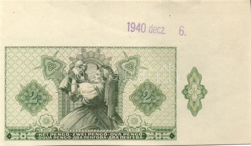 1940. 2P fázis, csak hátlapi nyomat, jobb feslő sarokívszél, lila "194... https://www.darabanth.com/hu/127-Gyorsarveres/127.0/Numizmatika/Osztrakmagyar-bankjegyek-magyar-es-magyar-vonatkozasu-bankjegyek-Hungarian-Austro-hungarian~500183/1940-2P-fazis-csak-hatlapi-nyomat-jobb-feslo-sarokivszel-lila-1940decz6-vonalbelyegzo~II354546