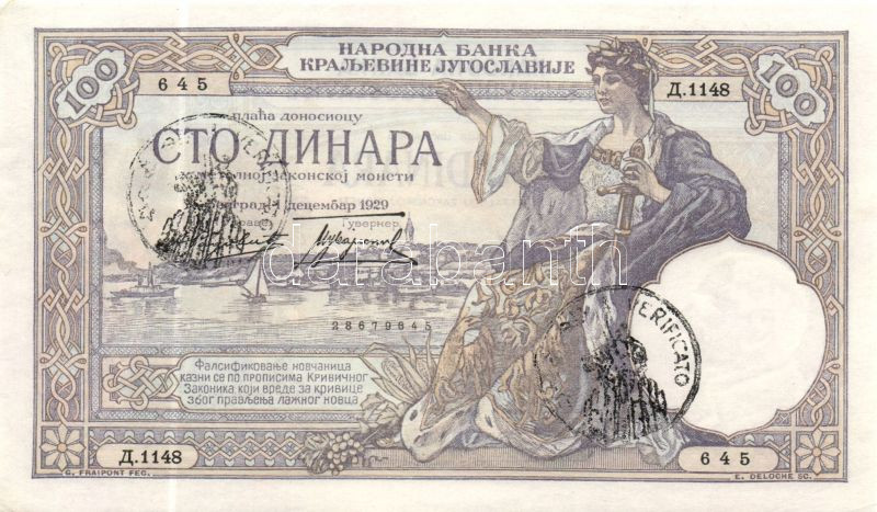 Leírás: Jugoszlávia 1926. 100D "Verificato" bélyegzéssel T:I