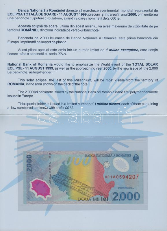 Leírás: Románia 1999. 2000L "Napfogyatkozás" 001A sorozat, eredeti dísztokban / leírással T:I